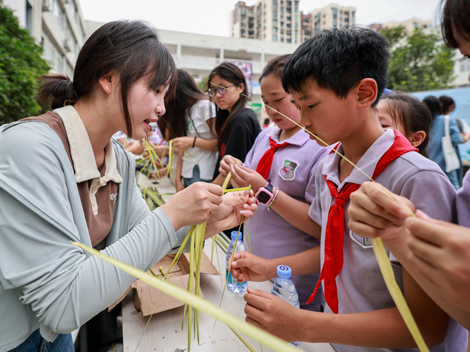 活动现场,一双双灵巧的手,将一片片粽叶、一粒粒糯米包裹成一个个香甜可口的粽子,欢声笑语此起彼伏,气氛和谐融洽。现场还开展了投壶游戏和垃圾分类知识宣传等丰富多彩的活动。