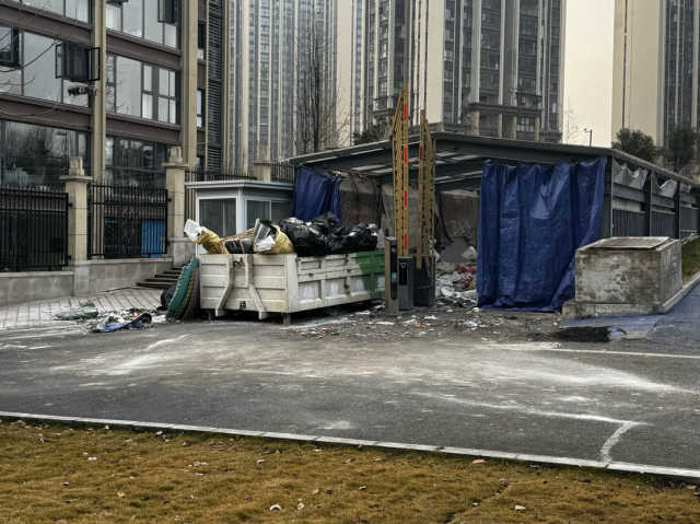 随后,记者来到长兴·星城二期物业客户服务中心了解到,长兴·星城二期于2020年交房,共有住户900户,当前还有近300户没有装修,因此经综合考虑,暂时在16号楼旁的车库出入口设置了一个建渣倾倒点。